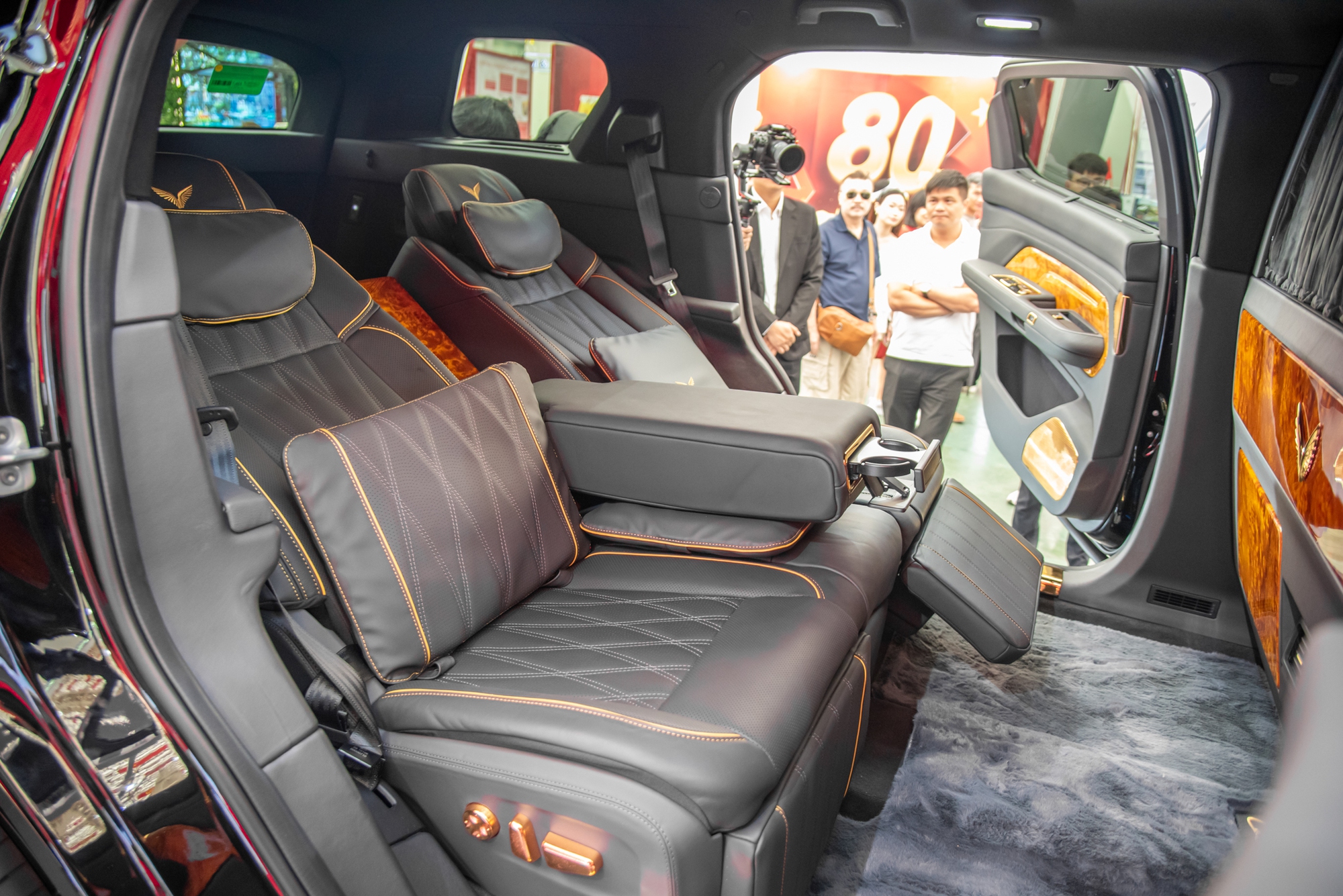 Đáng chú ý, khoang sau được tách biệt với hàng ghế trước bằng vách ngăn kính có thể nâng hạ, đi kèm rèm màu đen tăng tính riêng tư. Phần vách ngăn này cũng được ốp gỗ và trang trí thêm logo Lạc Hồng