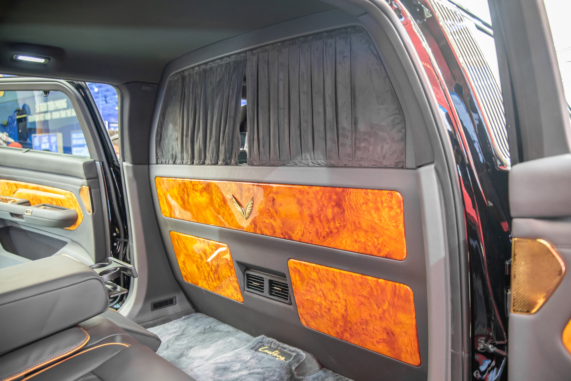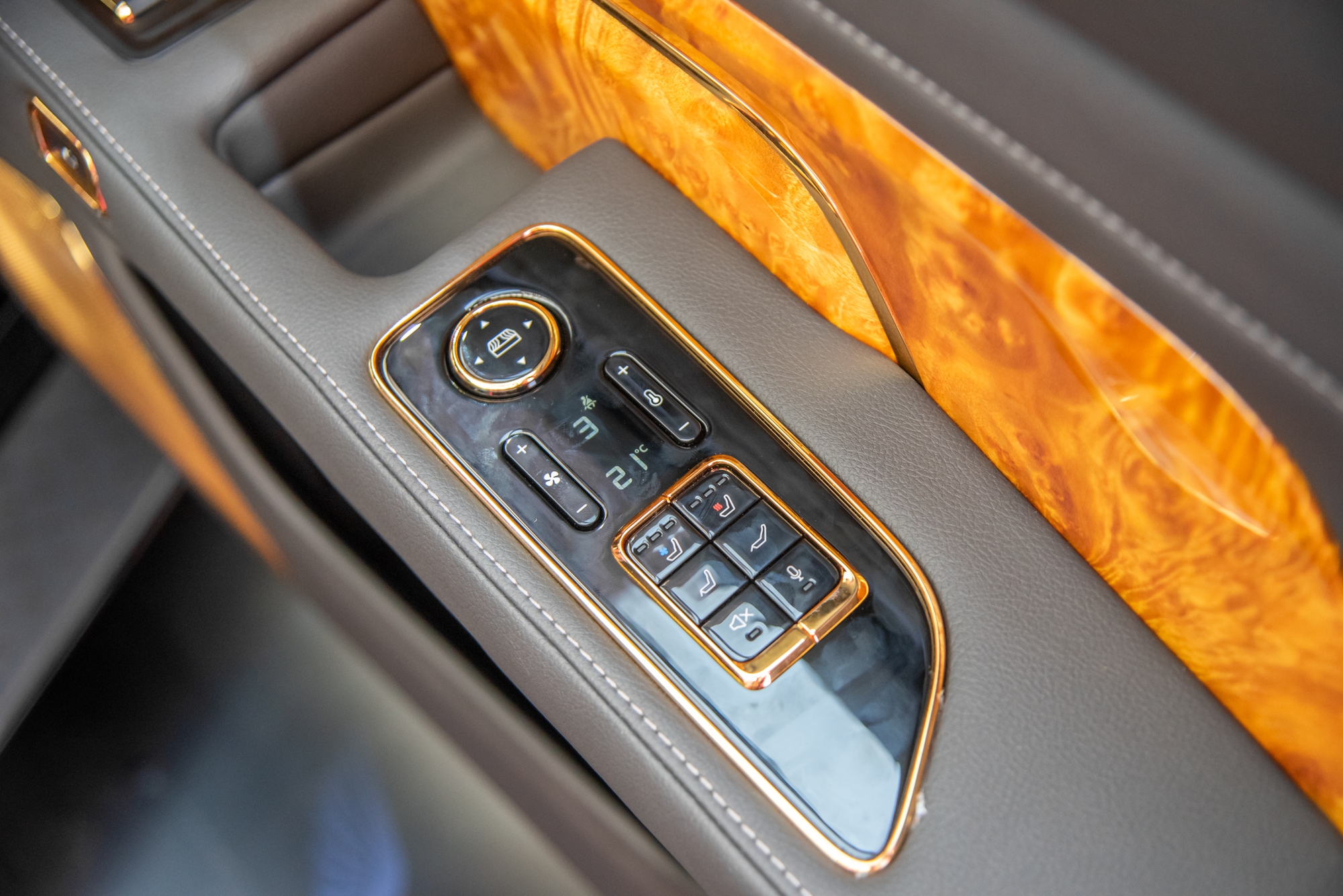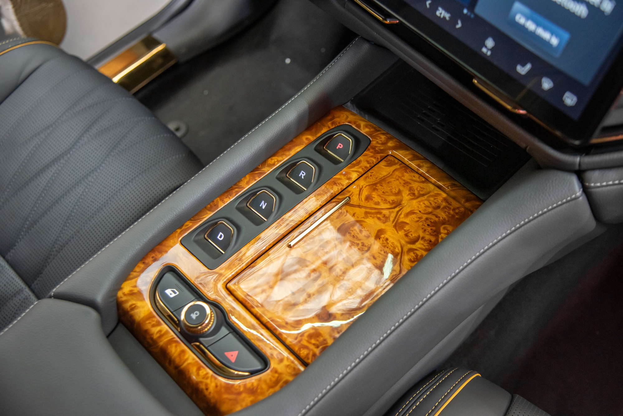 Cánh cửa sau tiếp tục được ốp gỗ Golden Nanmu, kết hợp các chi tiết mạ vàng, tạo nên tổng thể sang trọng và đồng bộ với khoang nội thất