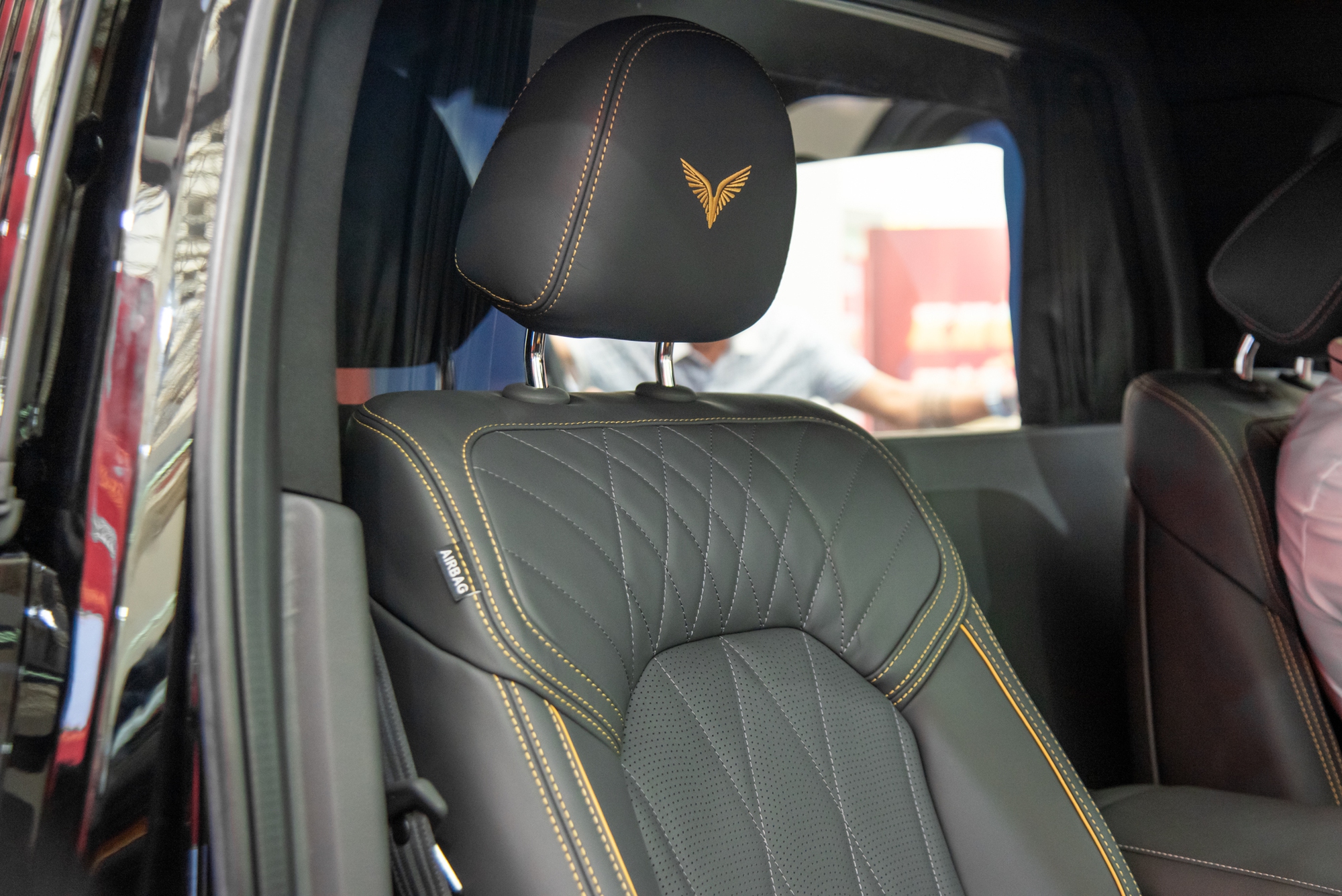 Ghế ngồi được thêu chỉ vàng tương phản, tựa đầu dập nổi logo Lạc Hồng, tạo điểm nhấn riêng biệt cho không gian nội thất