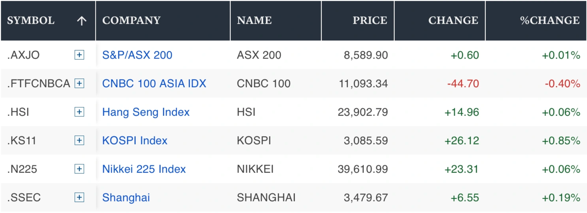 Mặc dù vậy, thị trường khu vực vẫn giữ được sắc xanh nhờ lực đỡ từ tâm lý kỳ vọng rằng các biện pháp thuế quan này có thể không kéo dài. Tại Nhật Bản, chỉ số Nikkei 225 tăng 0,18%, trong khi Topix gần như đi ngang. Tại Hàn Quốc, chỉ số Kospi tăng 1,01%, còn chỉ số Kosdaq ít biến động.