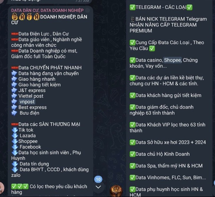 Nhiều hội nhóm kín trên mạng xã hội (Facebook, Telegram…), các website ngách, thậm chí chatbot tự động rao bán data khách hàng: tên, số điện thoại, địa chỉ, thu nhập, tài khoản ngân hàng… Đủ cả gói miễn phí lẫn có phí, với cam kết “bảo hành” hoặc cập nhật dữ liệu theo yêu cầu.
