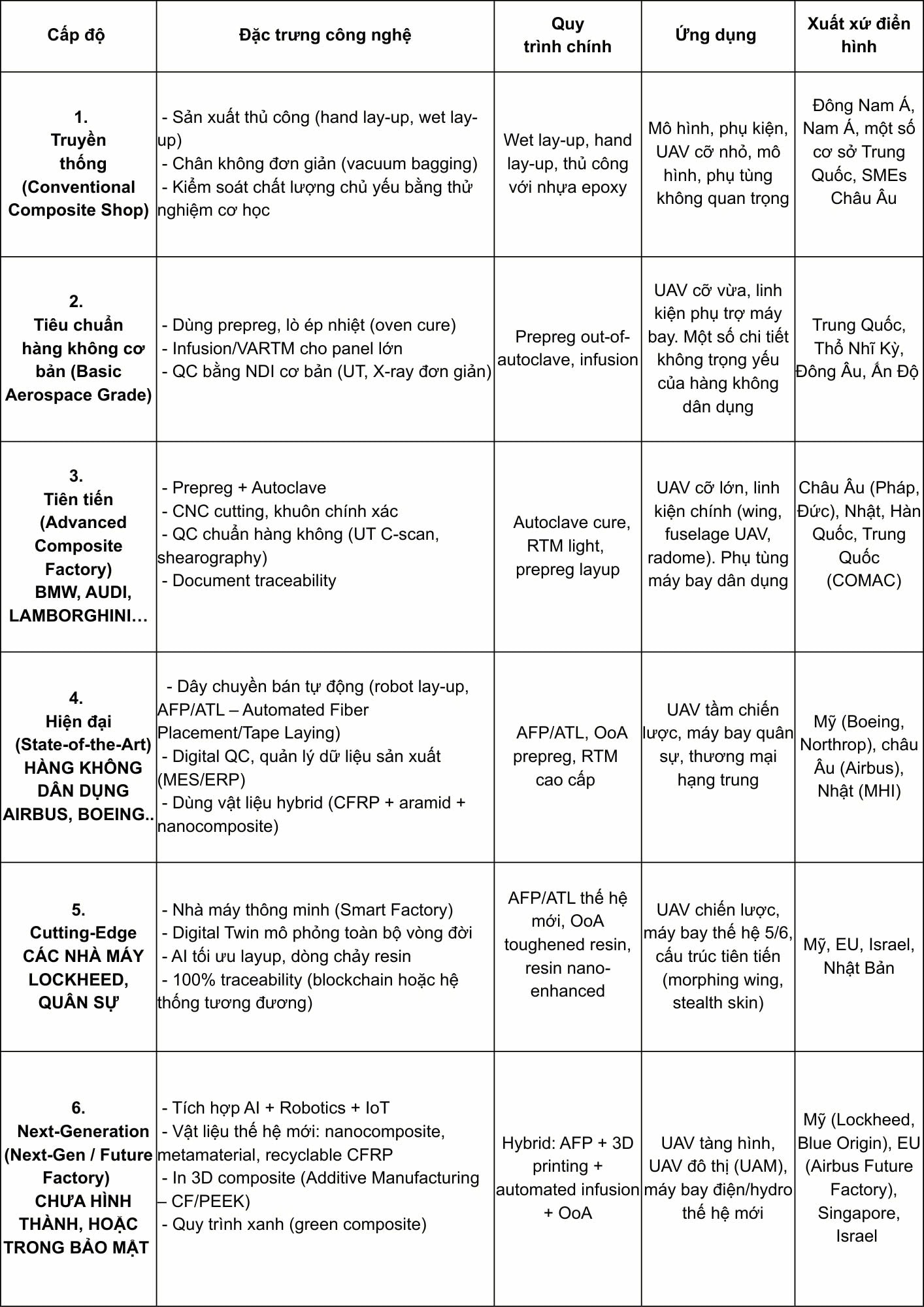- Vật liệu: Khả năng nghiên cứu, sản xuất và xử lý vật liệu composite tiên tiến (carbon prepreg, thermoplastic composites, nano-composites).