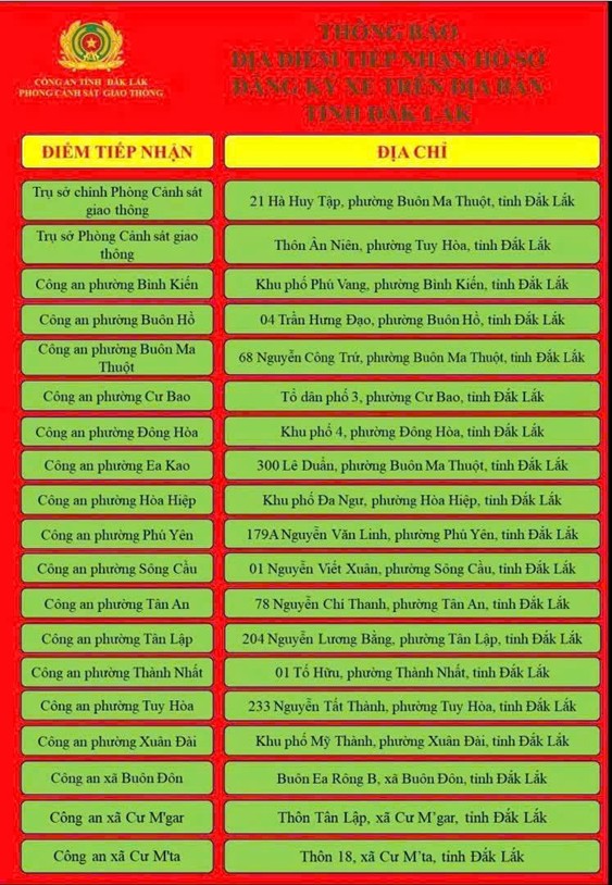 Nhằm tạo điều kiện thuận lợi cho người dân khi thực hiện các thủ tục đăng ký xe, Phòng Cảnh sát giao thông Công an tỉnh Đắk Lắk trân trọng thông báo các địa điểm đăng ký xe trên địa bàn tỉnh Đắk Lắk “mới” kể từ ngày 01/7/2025.