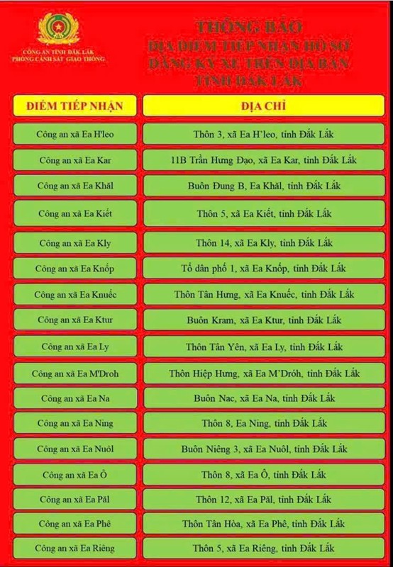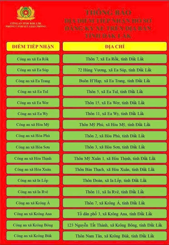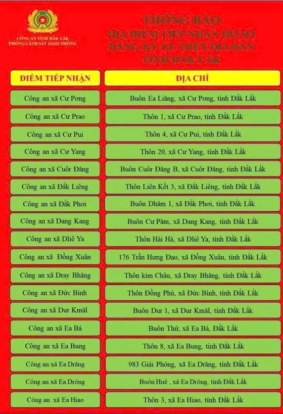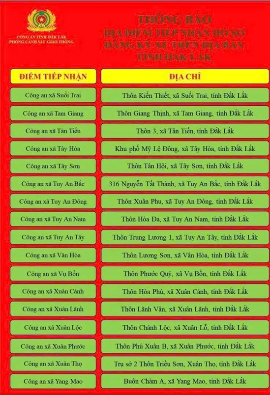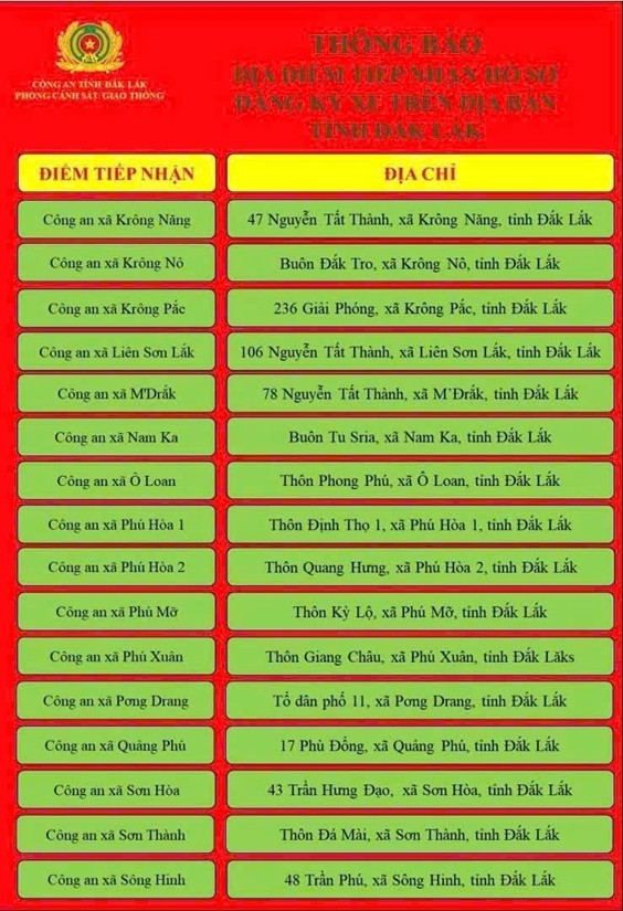 Phòng Cảnh sát giao thông Công an tỉnh Đắk Lắk thông báo đến quý Nhân dân thông tin về 104 điểm đăng ký xe trên địa bàn tỉnh Đắk Lắk “mới”
