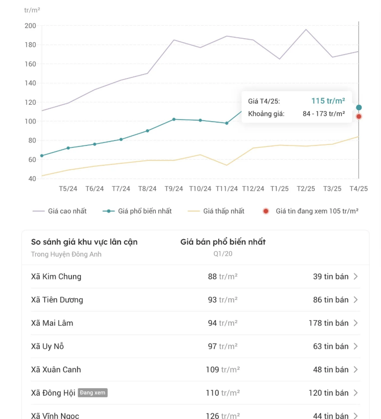 Trên các diễn đàn bán bất động sản tại Đông Anh, nhiều xã lân cận cũng được các môi giới chào giá khá cao, giá bán phổ biến được cập nhật dao động từ 88 – 126 triệu đồng/m2. Đối với một lô đất chừng 50m2, khách hàng cần phải bỏ ra số tiền từ 4,4 – 6,3 tỷ đồng để sở hữu.
