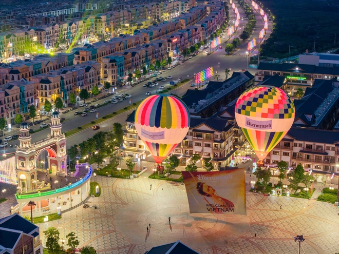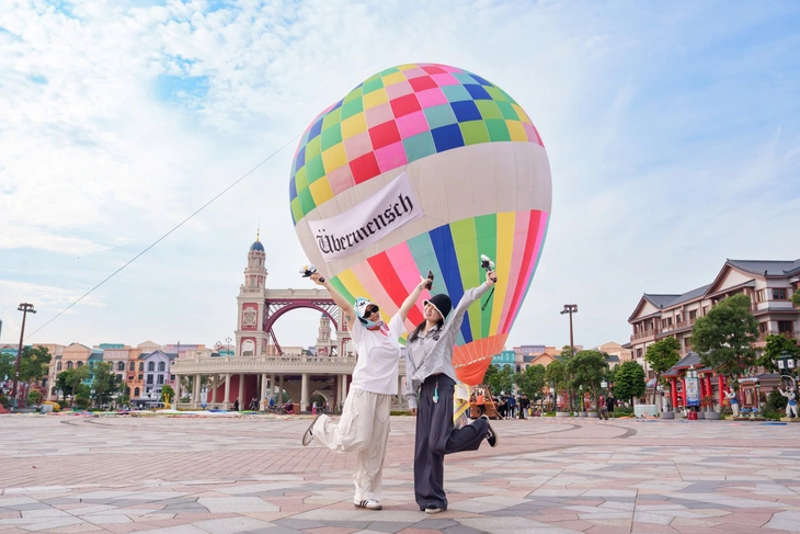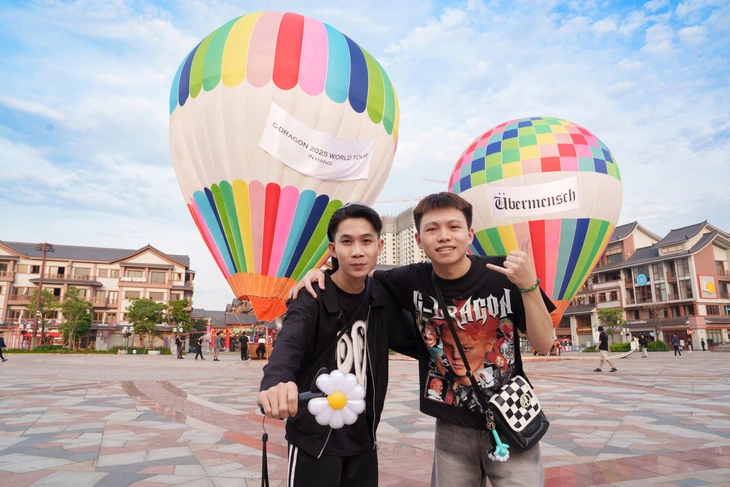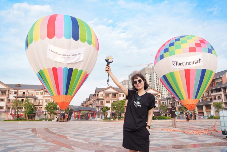 Ngay từ chiều 5-10, quảng trường K-Town (Vinhomes Ocean Park) bỗng trở thành tâm điểm khi hai chiếc khinh khí cầu rực rỡ bay lên mang theo banner “Übermensch – Welcome to Vietnam” và hình ảnh G-DRAGON nổi bật giữa trời thu.