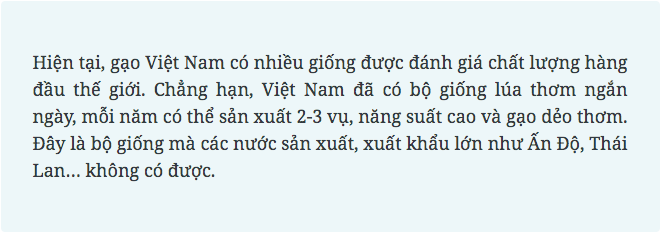 Theo ông Tiến, hiện tại, gạo Việt Nam có nhiều giống được đánh giá chất lượng hàng đầu thế giới. Chẳng hạn, Việt Nam đã có bộ giống lúa thơm ngắn ngày, mỗi năm có thể sản xuất 2-3 vụ, năng suất cao và gạo dẻo thơm. Đây là bộ giống mà các nước sản xuất, xuất khẩu lớn như Ấn Độ, Thái Lan… không có được.