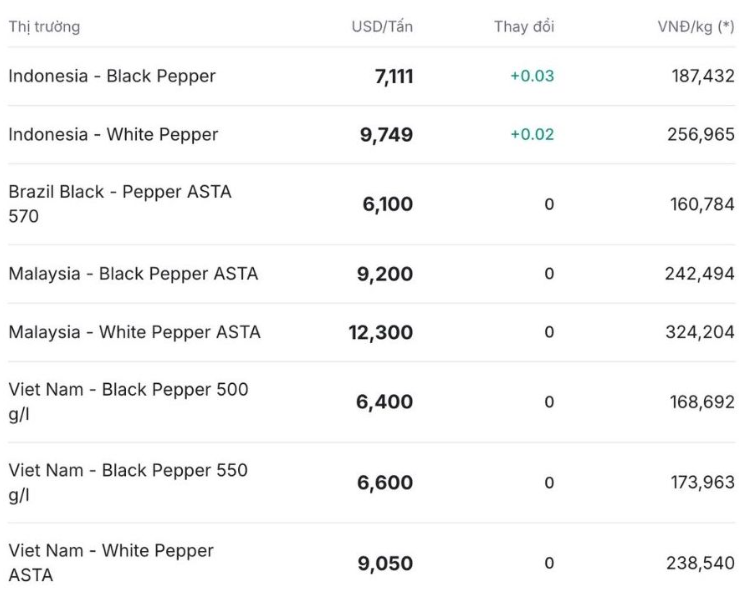Trên thị trường thế giới, giá tiêu phần lớn ổn định tại các khu vực. Riêng sàn giao dịch Indonesia – một trong những thị trường sôi động nhất có ngày thứ 2 liên tiếp tăng giá. Hiện hai mặt hàng này lần lượt tăng thêm 0,03% và 0,02%, giao dịch trong khoảng 7.111 – 9.749 USD/tấn (tương đương với 187.432 VND/kg – 256.965 VND/kg).
