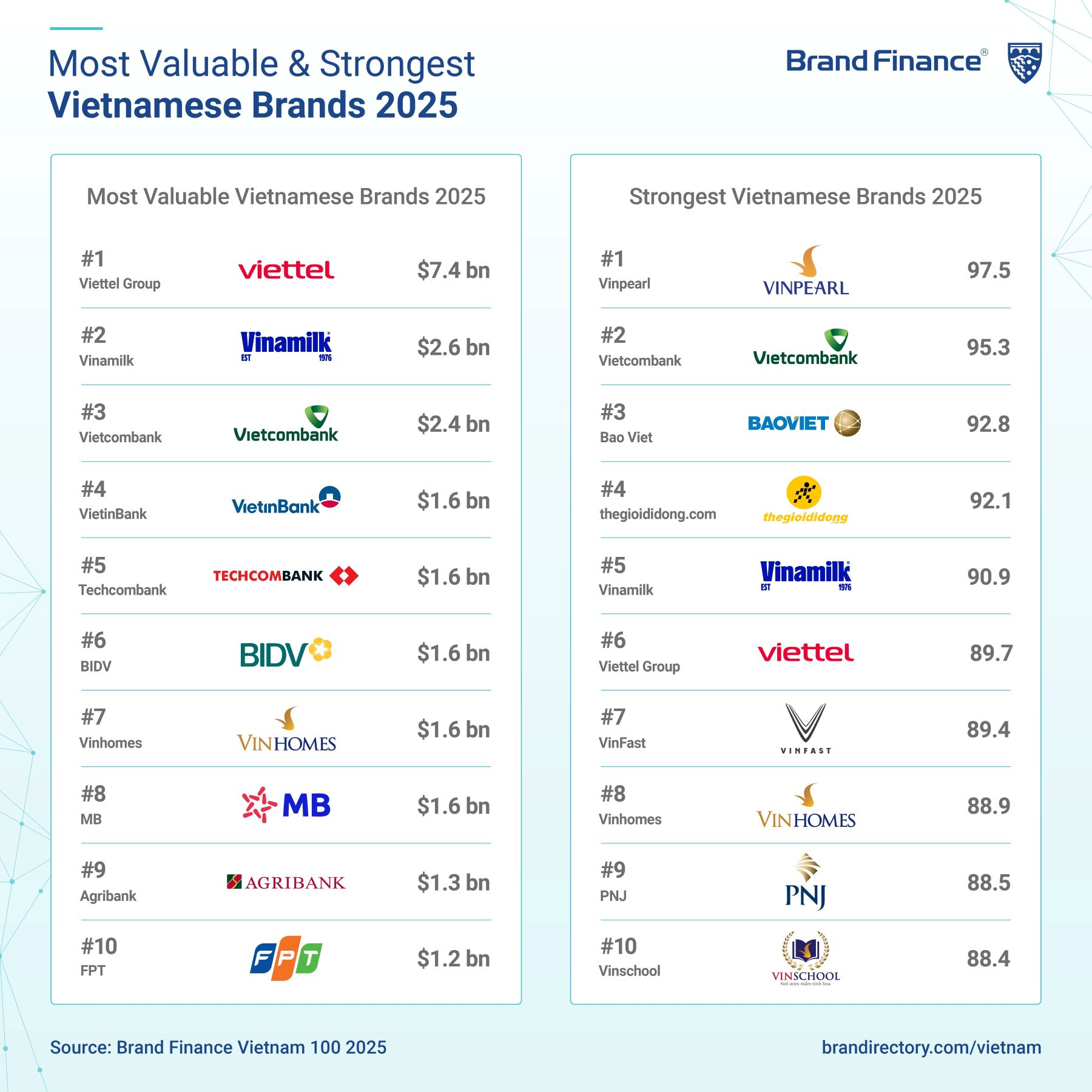 Hàng năm, Brand Finance khảo sát khoảng 6.000 thương hiệu lớn trên thế giới và công bố hơn 100 báo cáo chuyên ngành. Danh sách “Vietnam 100” là bảng xếp hạng các thương hiệu có giá trị và sức mạnh hàng đầu tại Việt Nam.