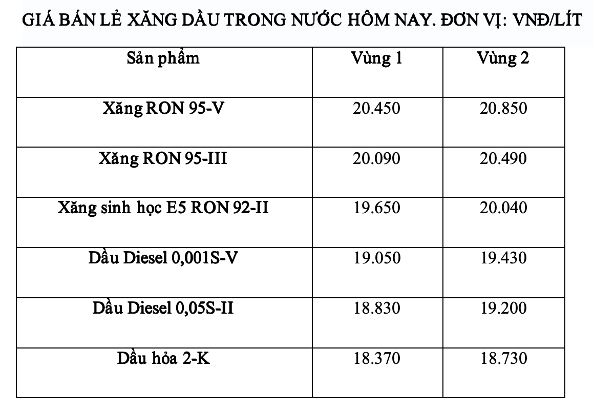 Công ty TNHH Thương mại Tổng hợp Hoàng Trọng: Kho Hải linh, Hải phòng: Dầu Diesel 0,05S – II: 1.300 đồng/lít; xắng RON 95 – III: 1.250 đồng/lít; Kho Mipec: xăng RON 95 – III: 1.250 đồng/lít; Kho Bắc Ninh: Dầu Diesel 0,05S – II: 1.150 đồng/lít; xắng RON 95 – III: 1.100 đồng/lít; Kho Nghi Sơn: Dầu Diesel 0,05S – II: 1.350 đồng/lít, xăng RON 95 – III: 1.300 đồng/lít; Kho Đình Vũ, Petec: Xăng E5 RON 92: 1.150 đồng/lít; xắng RON 95 – III: 1.250 đồng/lít.