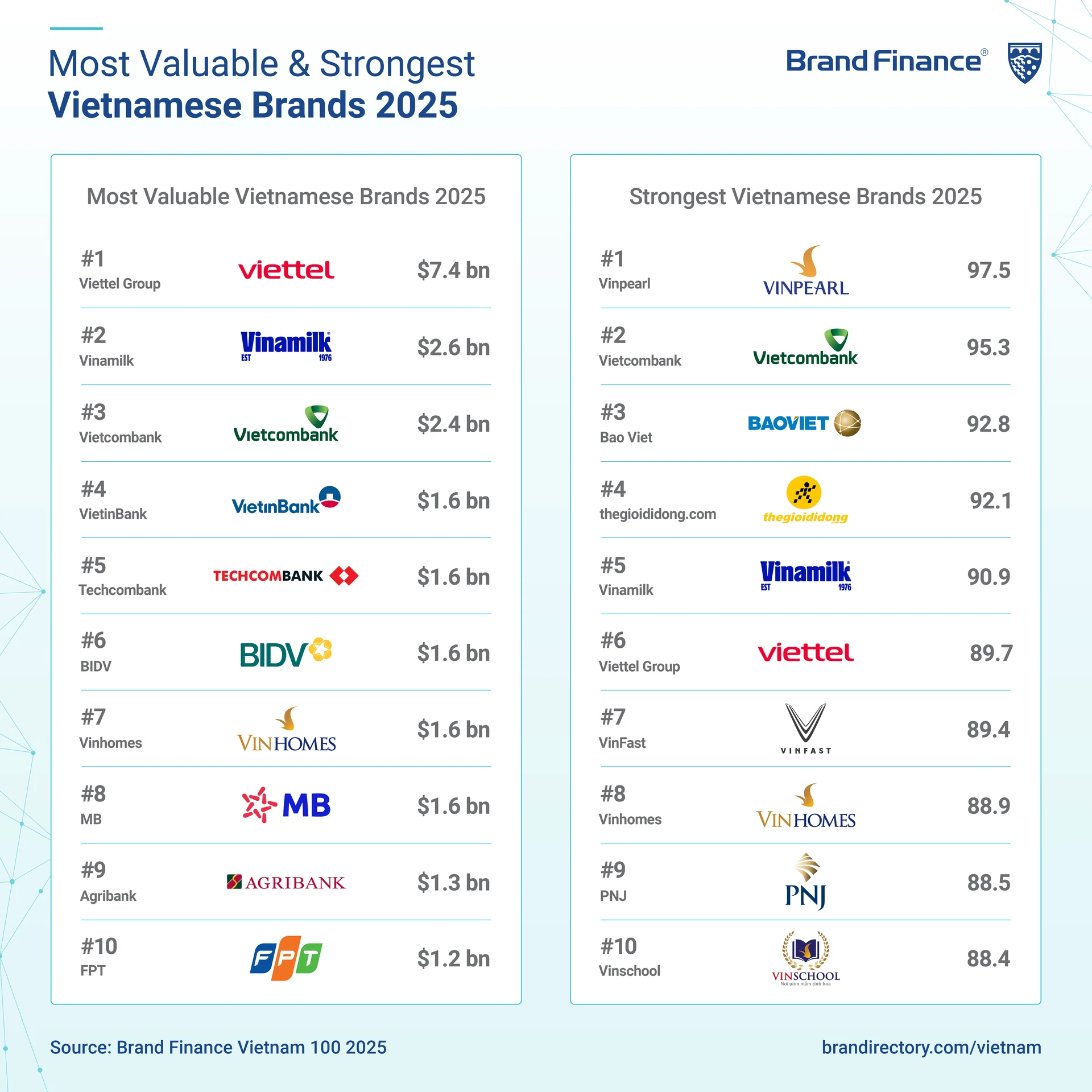 Theo báo cáo của Brand Finance, tổng giá trị 100 thương hiệu lớn nhất Việt Nam năm 2025 đạt 38,4 tỷ USD. Trong đó, Viettel đứng đầu với 7,4 tỷ USD, theo sau là Vinamilk và Vietcombank.