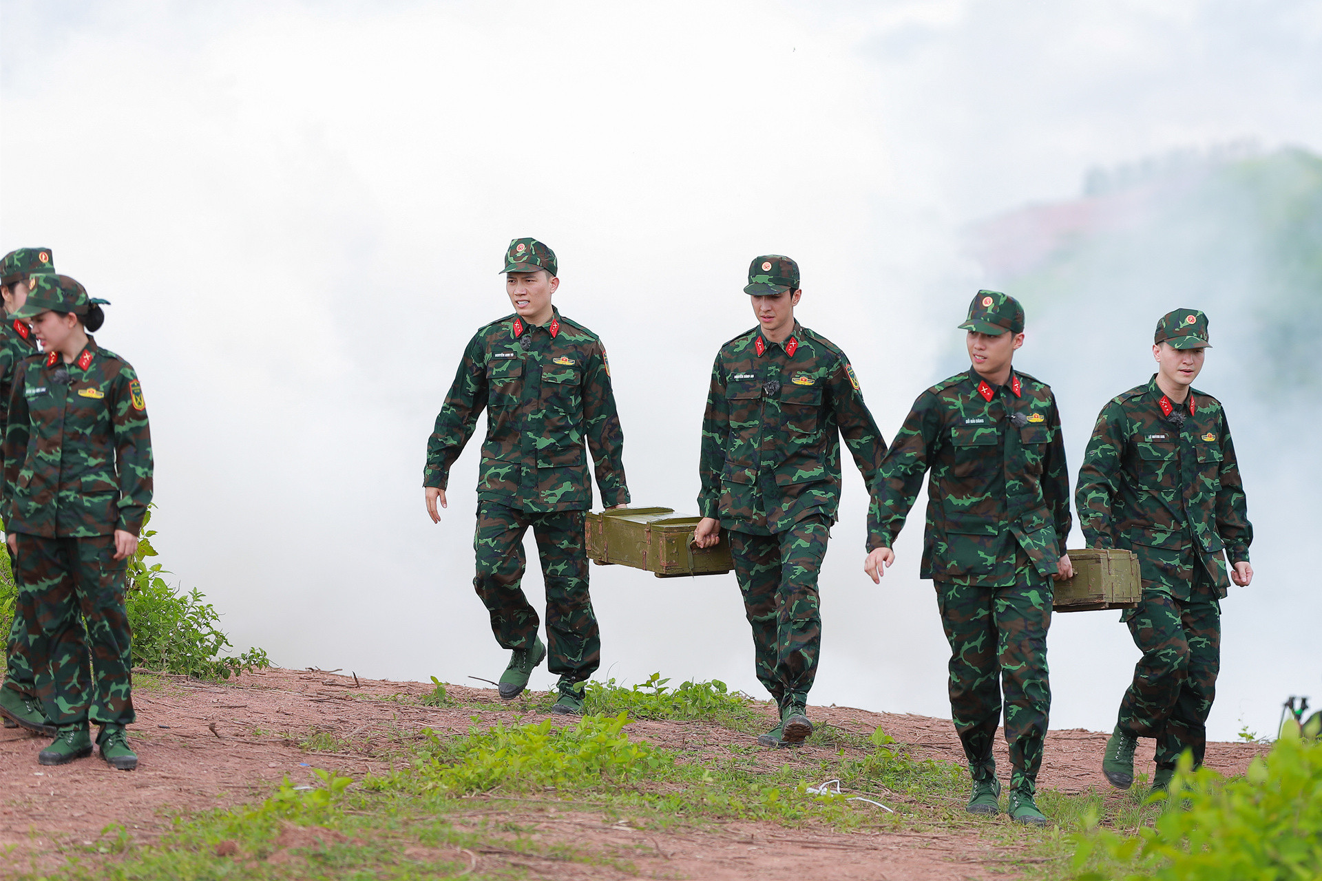 Vừa đến thao trường, các nghệ sĩ bất ngờ nhận lệnh vận chuyển đạn lên điểm cao từ chỉ huy. Dưới nắng gay gắt, địa hình dốc và khói cay dày đặc, họ chật vật thực hiện nhiệm vụ, nhất là các nữ nghệ sĩ.
