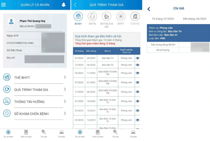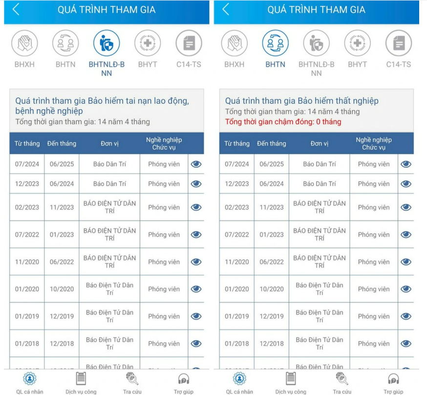 Tại đây, bạn sẽ nắm rõ được quá trình tham gia BHXH, thời gian chậm đóng bảo hiểm (nếu có). Nhấn vào biểu tượng con mắt ở mỗi mục để xem chi tiết về mức đóng BHXH dựa vào tiền lương hàng tháng của người dùng.