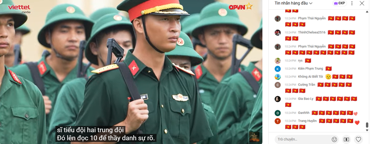 Trong giây phút ấy, khán giả cũng nhắn nhủ nhau “Chào cờ online”. Màn hình trên YouTube cũng rực rỡ sắc màu lá cờ Tổ quốc.