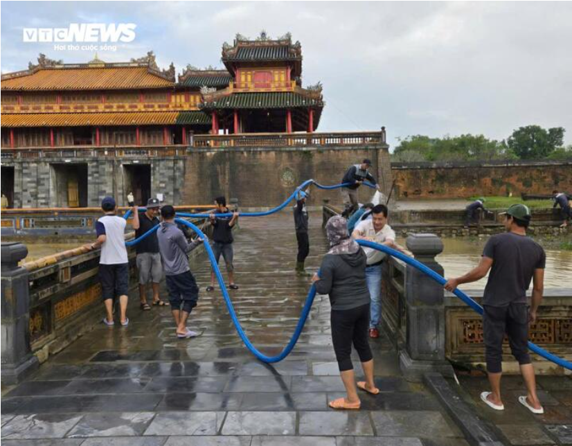 Trong những ngày mưa lũ lịch sử tại Huế, nhiều điểm di tích thuộc khu Di sản Huế bị ngập sâu. Sau đợt dọn dẹp đầu tiên vào ngày 29/10, nước lũ dâng cao trở lại khiến công tác vệ sinh khu Di sản Huế phải “làm lại từ đầu”. Riêng khu vực quảng trường Ngọ Môn rất rộng bị ngập sâu, nước rút để lại lượng bùn khổng lồ.