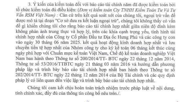 Một điểm nhấn khác trong báo cáo là ý kiến của đơn vị kiểm toán. Công ty TNHH Kiểm toán và Tư vấn RSM Việt Nam, đơn vị soát xét báo cáo tài chính bán niên, đã đưa ra “cơ sở của kết luận ngoại trừ”, tức không hoàn toàn chấp nhận toàn bộ các thông tin trên báo cáo tài chính của Hưng Phú ở một số khoản mục nhất định.