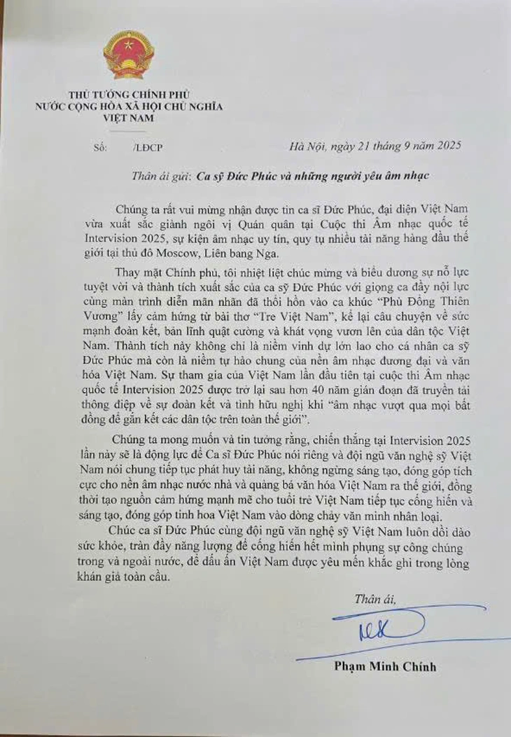 Trong thư, Thủ tướng viết: Chúng ta rất vui mừng nhận được tin ca sĩ Đức Phúc – đại diện Việt Nam vừa xuất sắc giành ngôi vị quán quân tại Intervision 2025 – sự kiện âm nhạc uy tín, quy tụ nhiều tài năng hàng đầu thế giới tại thủ đô Matxcơva, Liên bang Nga.