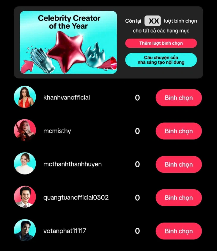 Hạng mục Nhà sáng tạo nội dung người nổi tiếng của năm quy tụ hoa hậu Nguyễn Trần Khánh Vân, “chị đẹp” Misthy, MC Thanh Thanh Huyền, diễn viên Quang Tuấn và diễn viên Võ Tấn Phát.