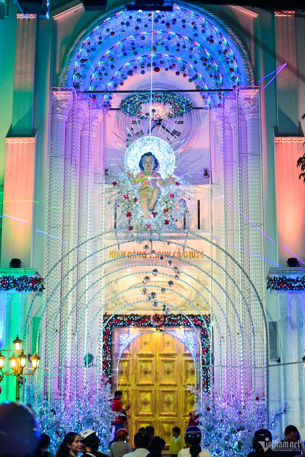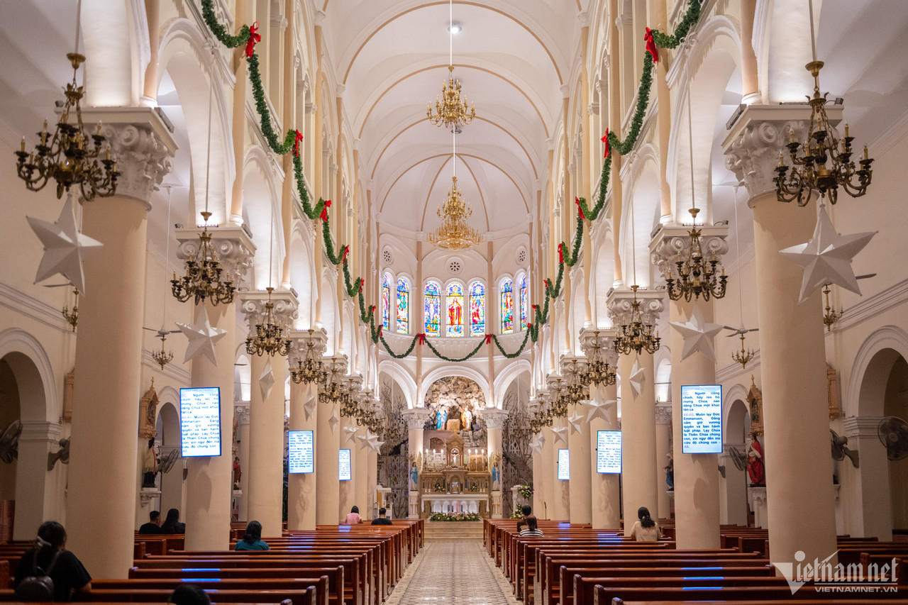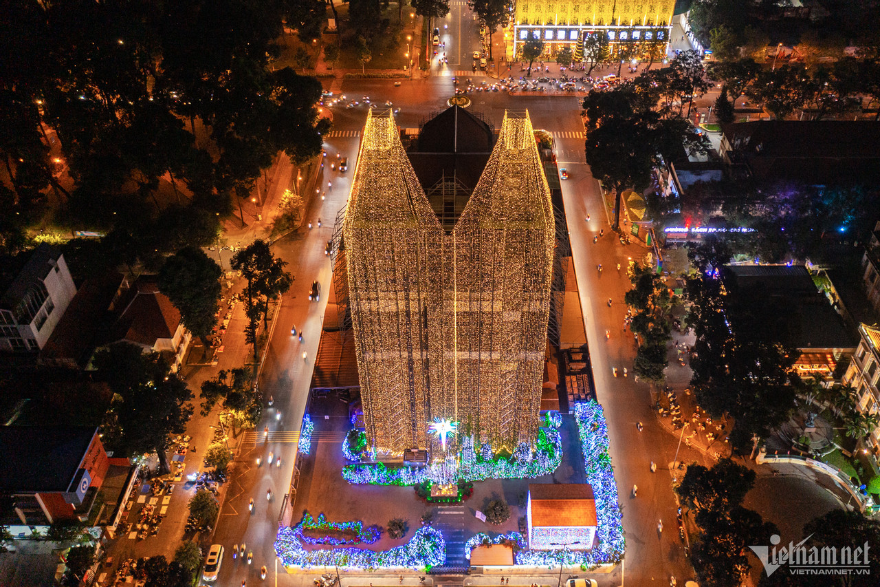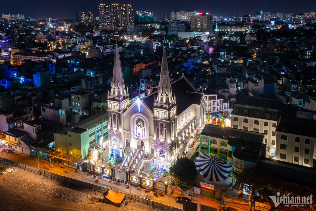 Đặc biệt nhất là nhà thờ Đức Bà ở quận 1. Công trình vẫn đang trong quá trình trùng tu và sửa chữa nên chỉ có phía khuôn viên trước nhà thờ được trang trí với nhiều dây đèn vàng dài hơn 60m phủ kín 2 tháp chuông. Đây là trung tâm đón Giáng sinh lớn nhất TP.HCM nên dịp này rất nhiều người dân đặc biệt là các bạn trẻ đổ về check-in.