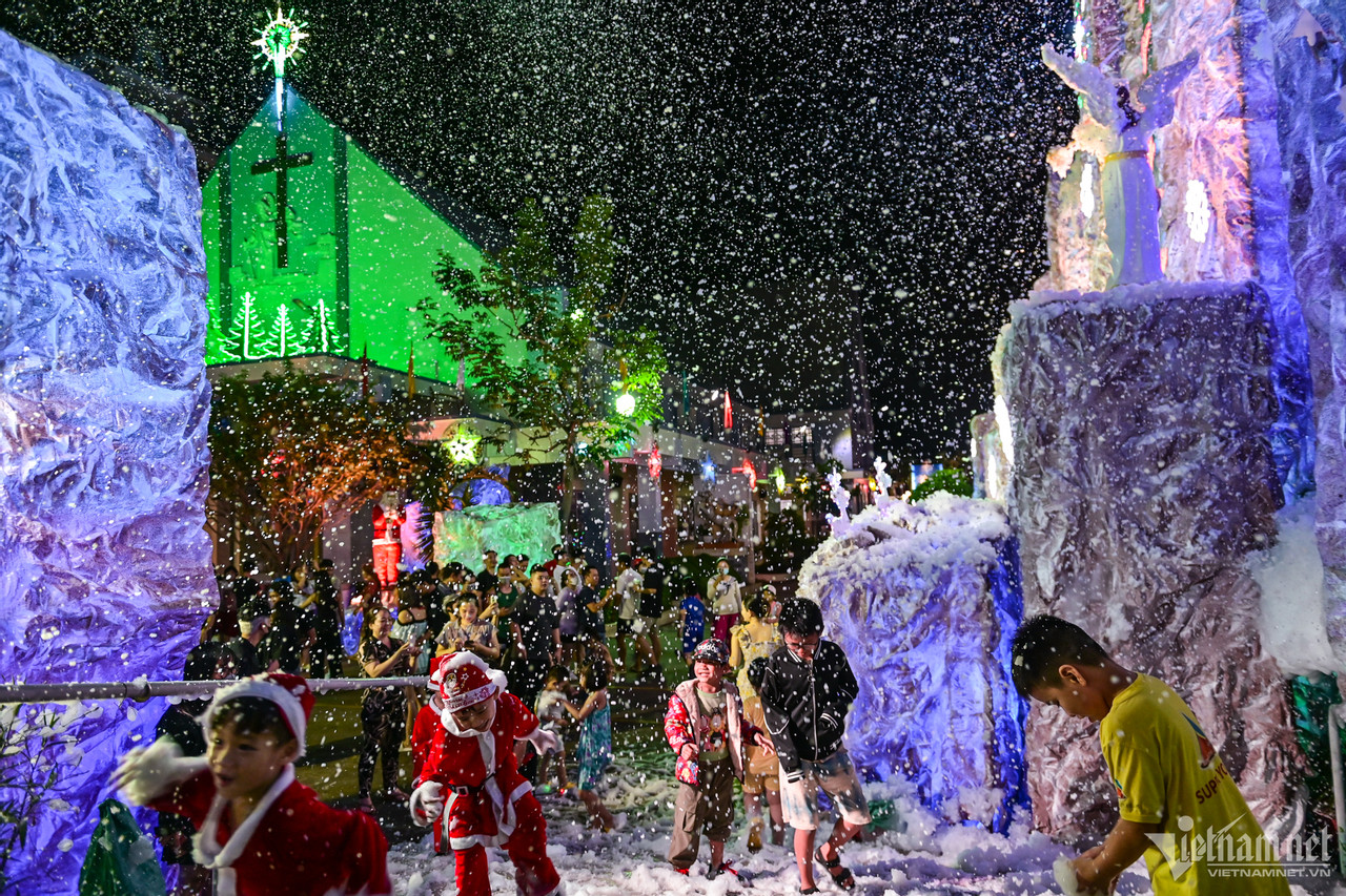 Gần đó, nhà thờ Giáo xứ Bình An Thượng có một hang đá lớn với hình dáng những khối đá vuông vắn được lắp ghép từ hơn 400kg bao bì nhựa. Nhà thờ cũng đầu tư máy phun tuyết nhân tạo nên đã thu hút rất đông người tới vui chơi.