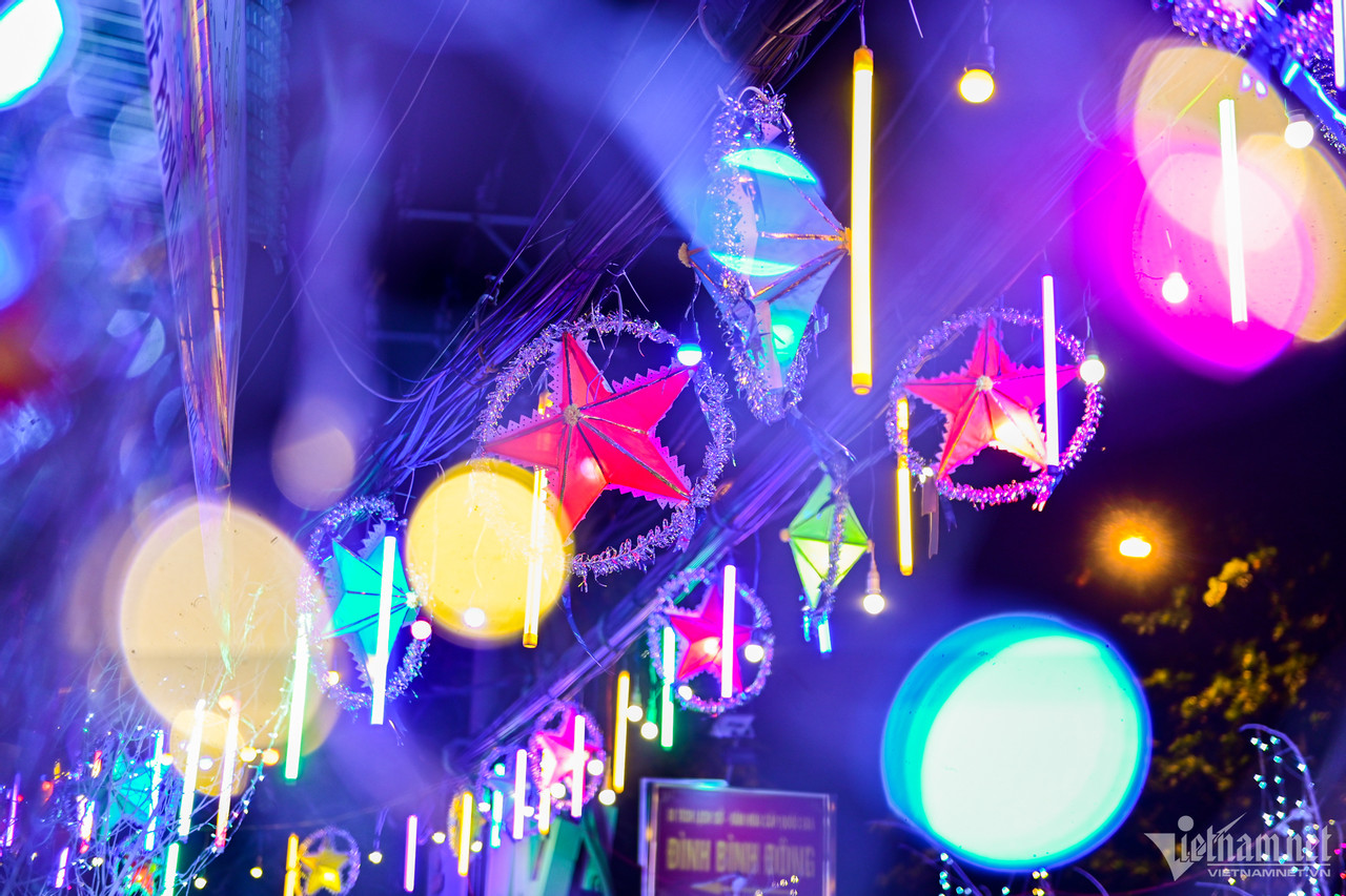 Dọc các con đường, lối hẻm đều được thắp đèn, treo sao rực rỡ.