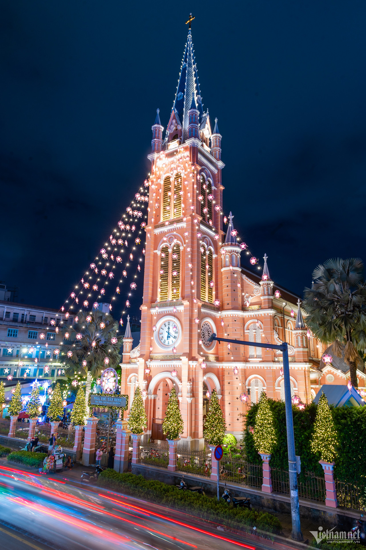 Nhà thờ Tân Định (hay còn gọi là Nhà thờ Thánh Tâm Chúa Giêsu) trên đường Hai Bà Trưng (quận 1) cũng được trang trí hoa đèn lộng lẫy. Màu hồng nổi bật của nhà thờ cùng nhiều dây đèn rủ bao quanh tạo nên khung cảnh rực rỡ.