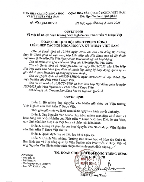 Ngày 06/8/2025, tại TP. Hà Nội, Viện Nghiên cứu Phát triển Y Dược Việt vừa tổ chức lễ công bố và trao quyết định bổ nhiệm Tiến sĩ, Bác sĩ Nguyễn Văn Nhiên giữ chức Viện trưởng, theo quyết định bổ nhiệm số 621/QĐ-LHHVN của Liên hiệp các Hội Khoa học và Kỹ thuật Việt Nam (VUSTA).