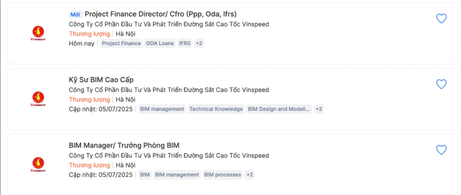 Ví dụ, Vinspeed đưa ra yêu cầu đối với vị trí kỹ sư BIM cao cấp là tốt nghiệp đại học trở lên các ngành kỹ thuật công trình, cầu đường, hạ tầng giao thông, hệ thống đường sắt… và có tối thiểu 5 năm kinh nghiệm thực tế, trong đó ít nhất 3 năm triển khai BIM tại các dự án lớn thuộc lĩnh vực hạ tầng, đặc biệt là cầu, đường sắt, metro hoặc công trình công cộng.