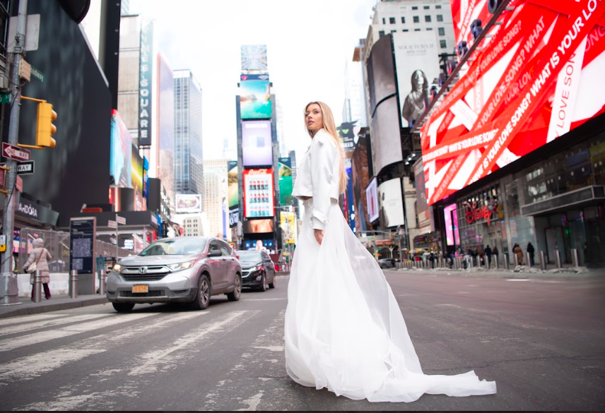 Trong layout thứ hai, sắc trắng được lựa chọn như một điểm nhấn giữa quảng trường rực sáng màn hình LED. Thiết kế tối giản với tà dài chuyển động theo từng bước chân, hòa cùng gió và không gian mở. Hai lựa chọn đối lập nhưng bổ trợ lẫn nhau, tạo nên mạch hình ảnh xuyên suốt, nơi thời trang không tách rời bối cảnh mà hòa vào nhịp sống của thành phố.