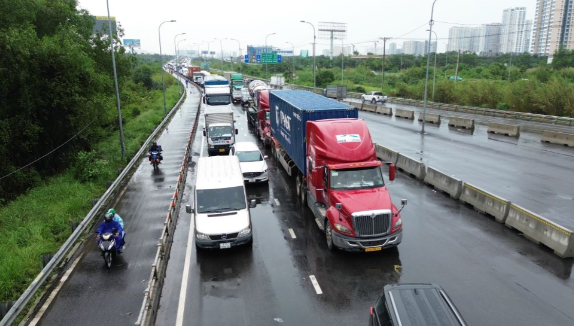 Tại đường dẫn cao tốc TPHCM – Long Thành – Dầu Giây, hướng về nút giao An Phú, các phương tiện ôtô, xe tải, xe container nối đuôi nhau kéo dài hàng km, nhiều người phải chờ đợi, nhích từng chút một.